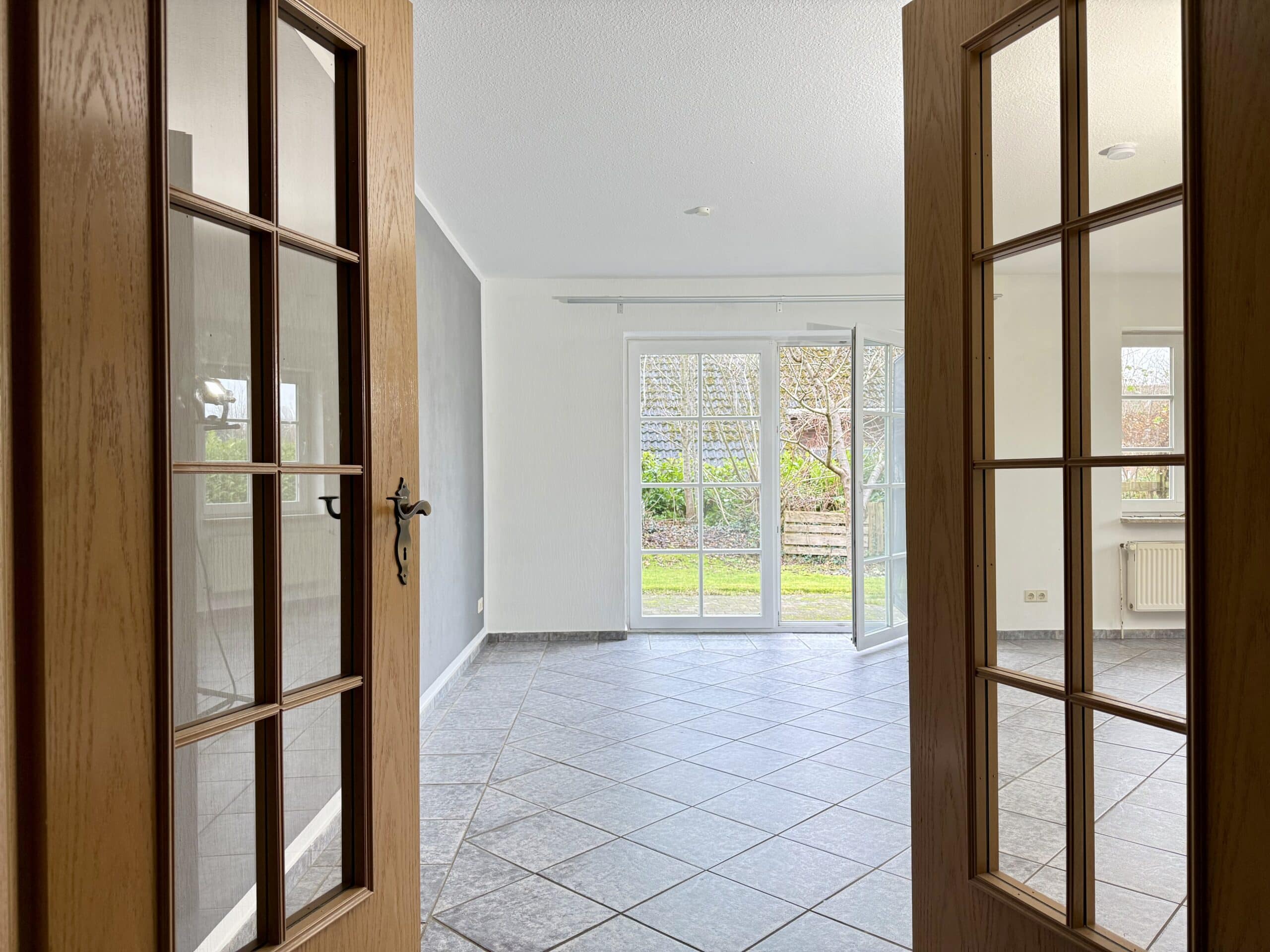Die Wohnung im Erdgeschoss steht aktuell leer. Die auf den Objektfotos gezeigten Innenräume sind nicht eingerichtet – Böden und Wände wurden nicht verändert und befinden sich im Originalzustand.