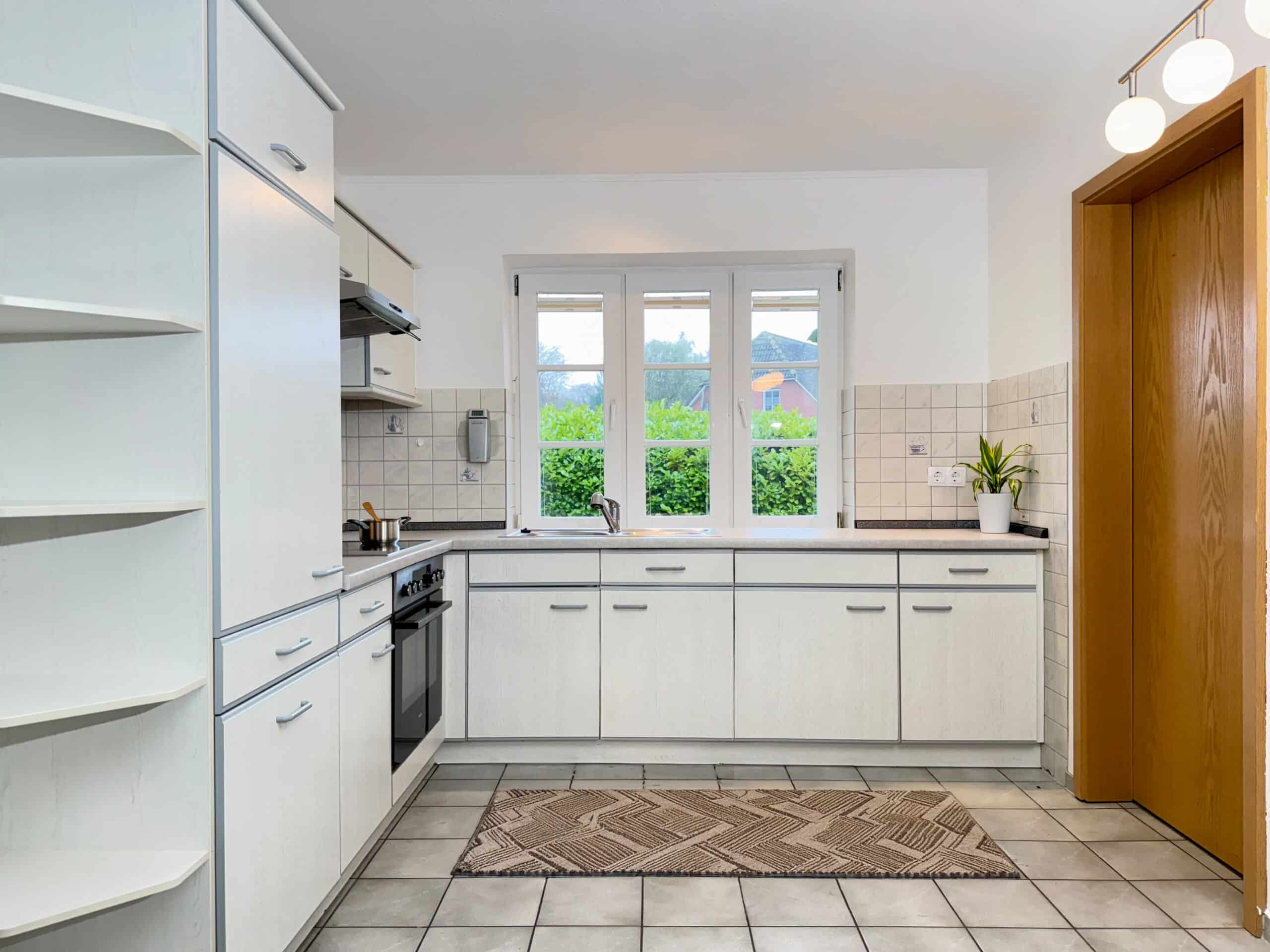 Die Erdgeschosswohnung verfügt über eine Wohnfläche von ca. 110 m² und überzeugt durch eine komfortable und durchdachte Raumaufteilung. Über das Treppenhaus erreichen Sie den Eingangsbereich, von dem aus sich alle Räume erschließen. Linker Hand befinden sich das Schlafzimmer sowie das im Jahr 2020 modernisierte Badezimmer mit Badewanne, ebenerdiger Dusche und Fußbodenheizung. Geradeaus gelangen Sie in ein weiteres Schlafzimmer sowie in den großzügigen Wohn- und Essbereich, der durch viel Tageslicht und den direkten Zugang zur Terrasse besticht. Rechts vom Flur befinden sich die Küche sowie ein praktischer Abstellraum.