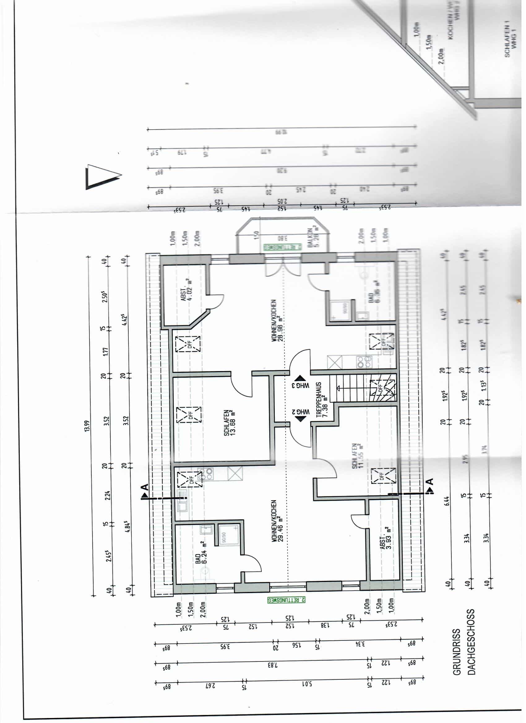Im Dachgeschoss befinden sich zwei weitere Wohnungen, die über das zentrale Treppenhaus erreichbar sind. Beide Einheiten sind nahezu spiegelgleich aufgebaut und verfügen über jeweils etwa ca. 50 m² Wohnfläche. Beim Betreten gelangen sie direkt in den offenen Wohn- und Essbereich mit integrierter Küche. Links befindet sich das Schlafzimmer, rechts das Badezimmer. Eine der beiden Wohnungen verfügt zusätzlich über einen Balkon. Beide Dachgeschosswohnungen sind derzeit vermietet; aus Gründen der Privatsphäre wurden keine Innenaufnahmen erstellt.