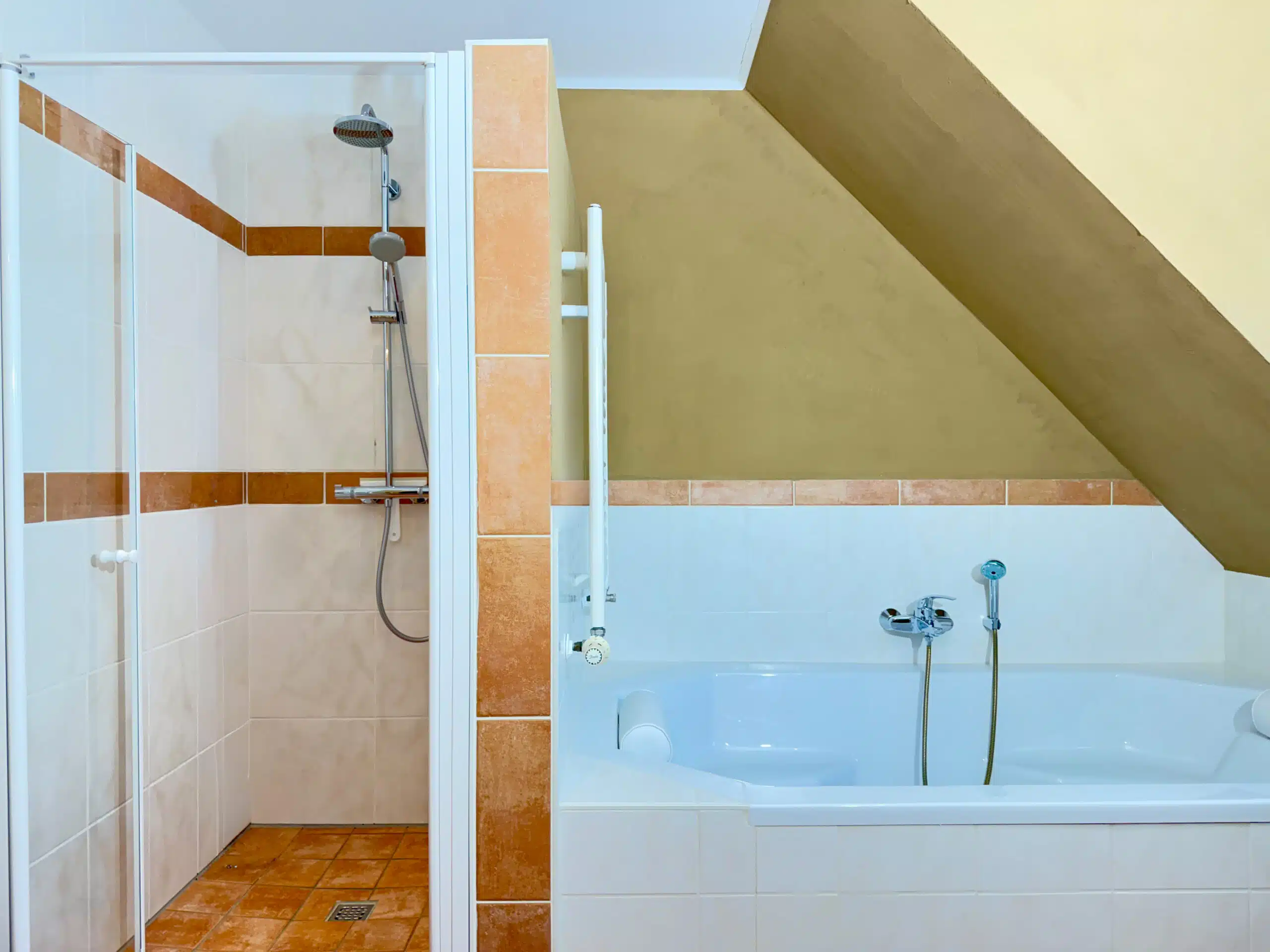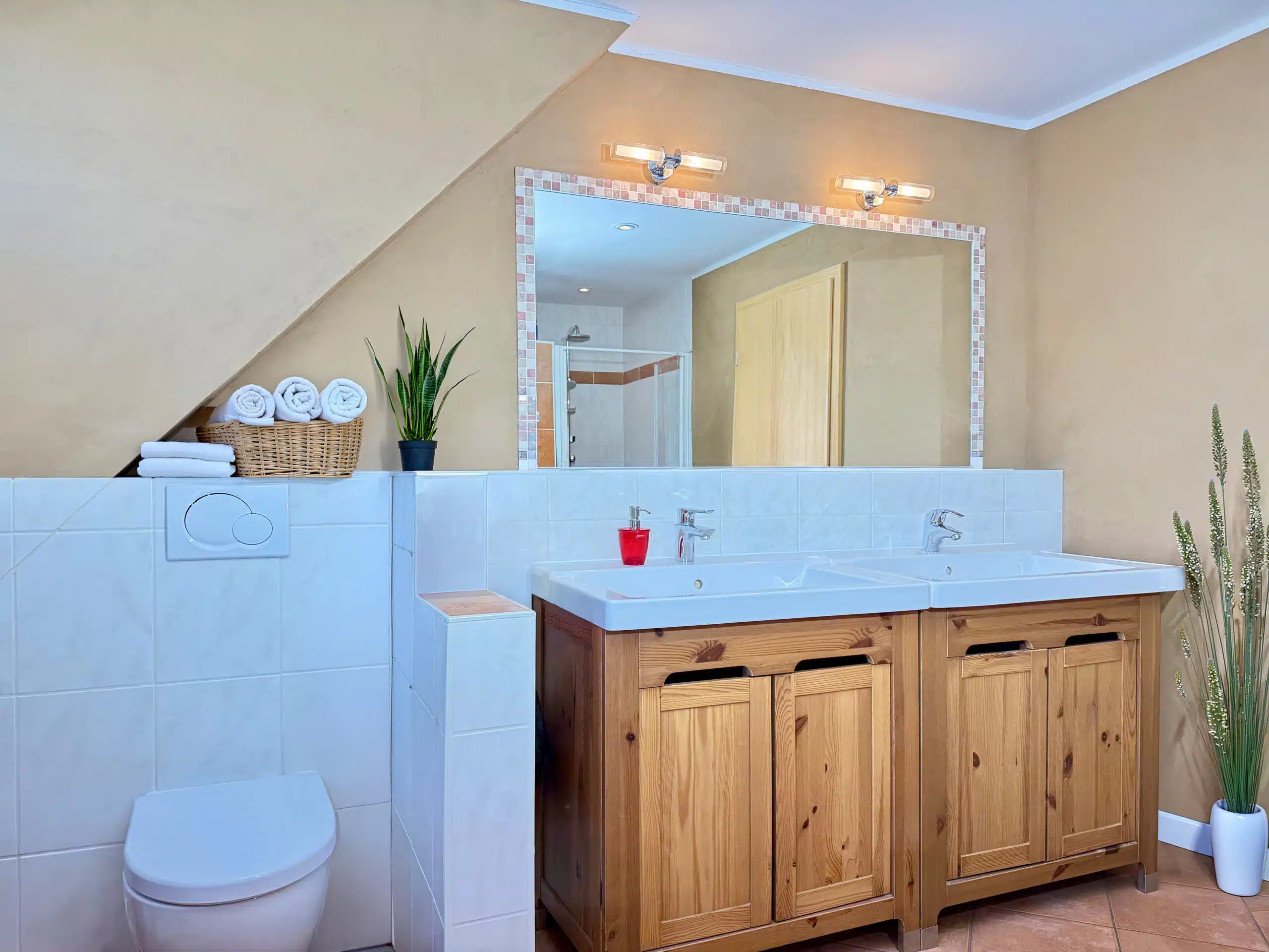 Über die massive Treppe gelangen Sie in das Obergeschoss des Hauses. Der dortige Flur erschließt insgesamt fünf Zimmer, die flexibel als Schlaf-, Kinder-, Gäste- oder Arbeitszimmer genutzt werden können. Das Badezimmer ist mit einer ebenerdigen Dusche und einer großzügigen Badewanne ausgestattet; auch hier sorgt eine Fußbodenheizung für angenehme Wärme. Die Fenster des Hauses stammen aus dem Baujahr und verfügen über Außenjalousien, teilweise elektrisch betrieben.
