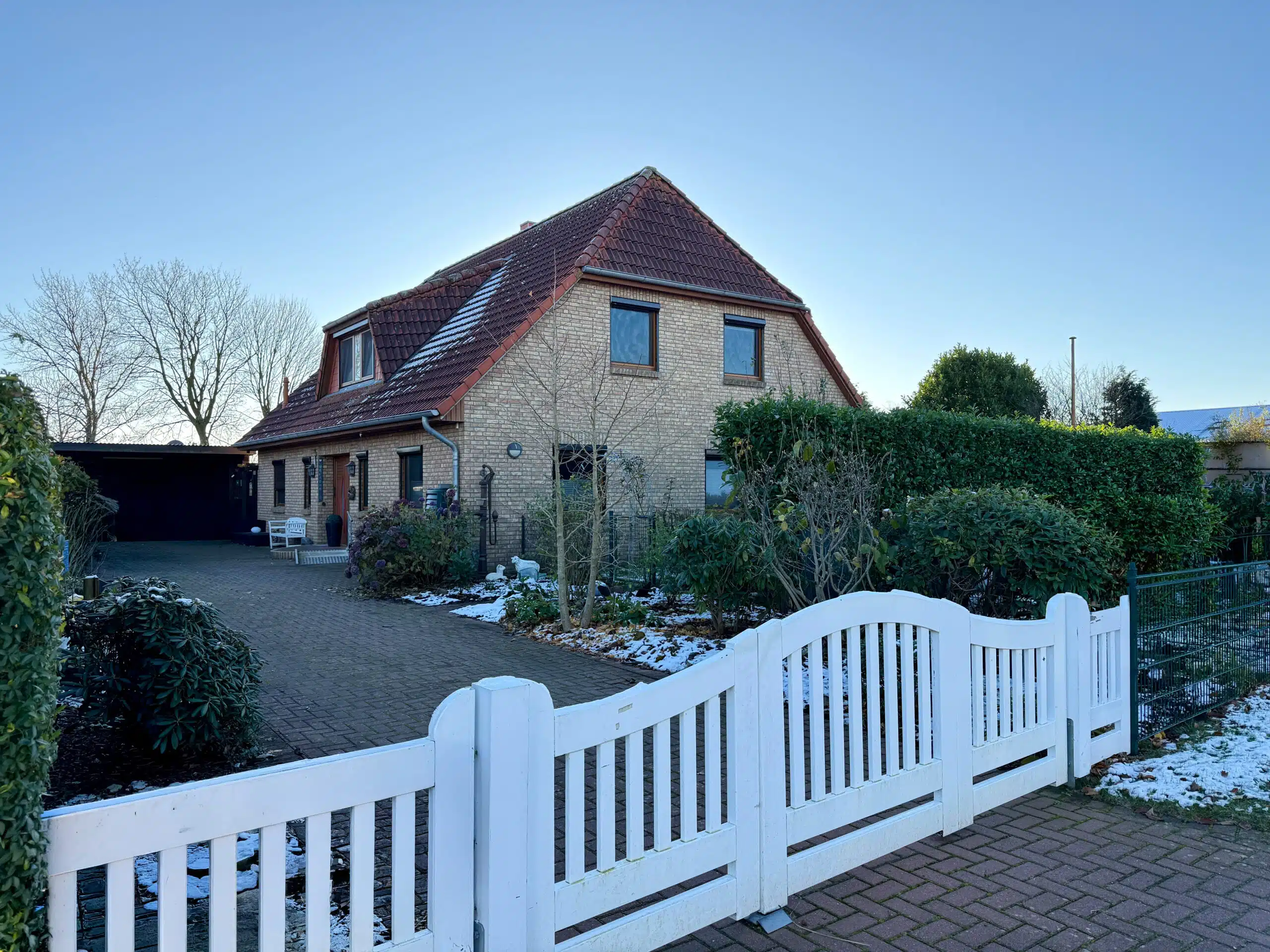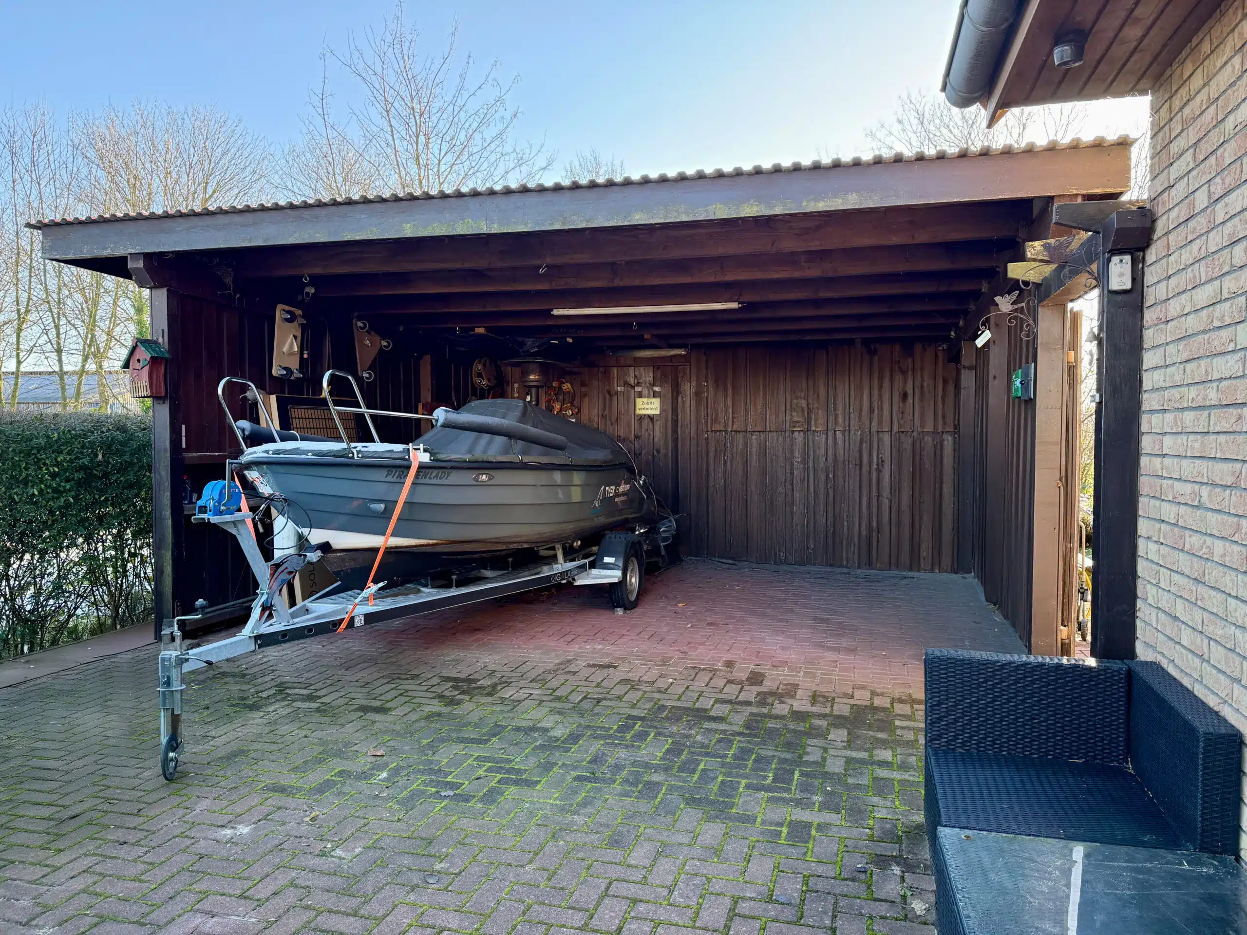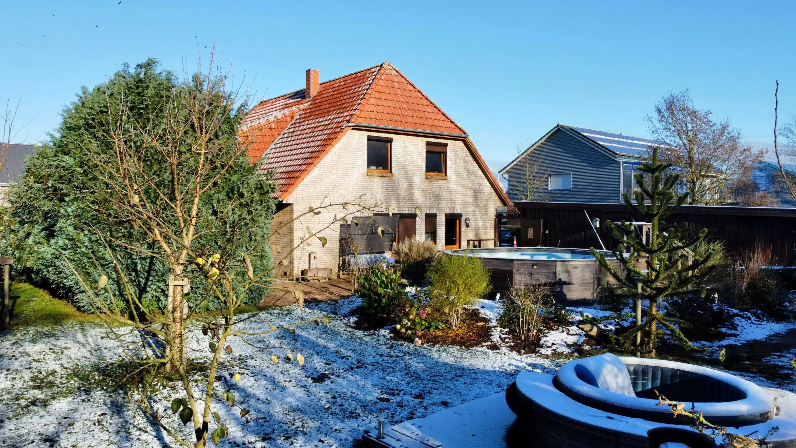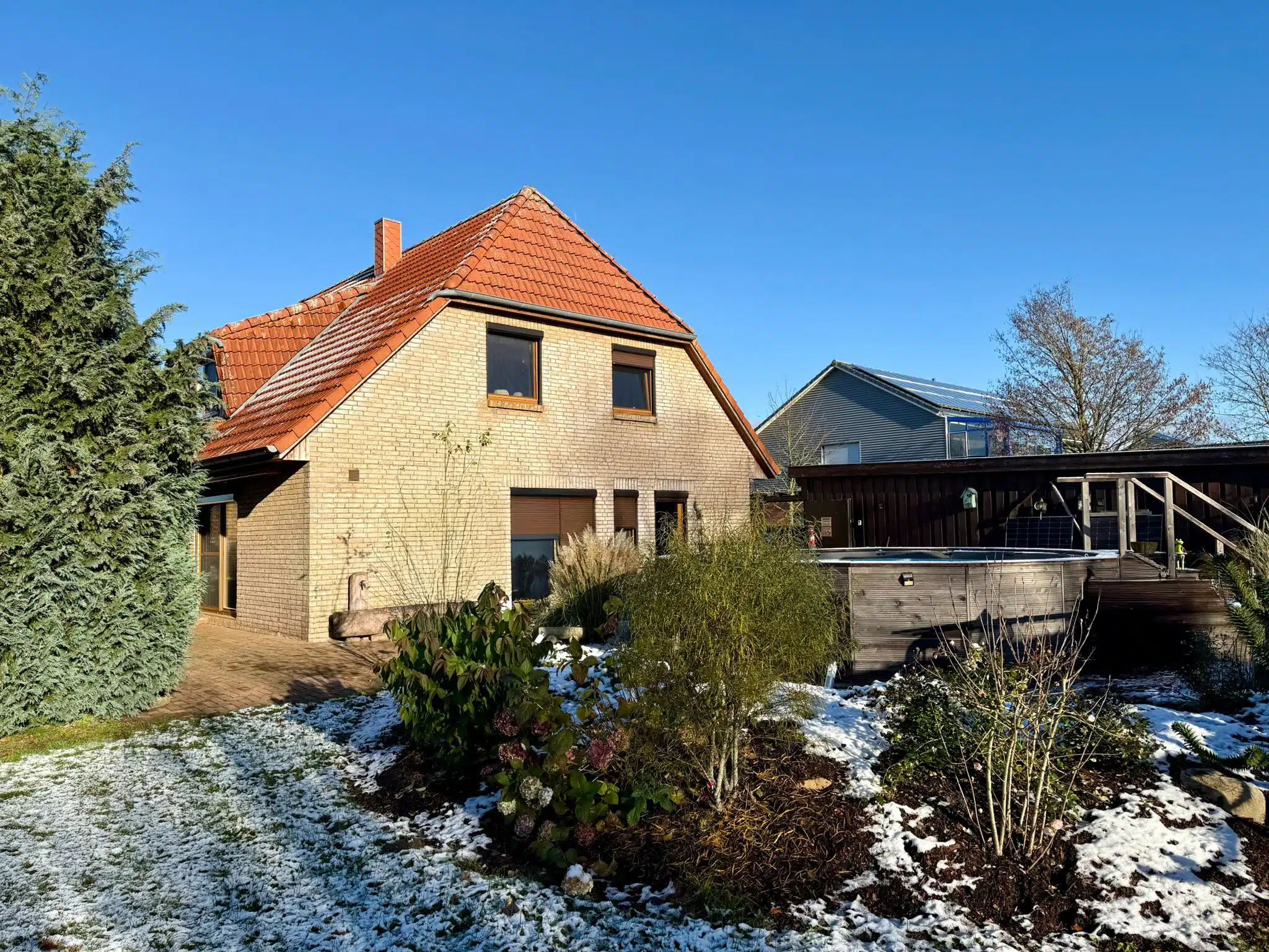 Bereits die Auffahrt mit Doppelcarport vermittelt einen einladenden ersten Eindruck. Von hier aus gelangen Sie trockenen Fußes direkt in den Hauswirtschaftsraum – besonders praktisch, um Einkäufe sofort und ohne Umwege zu verstauen. Der Garten überzeugt mit viel Platz, zwei separaten Gartenschuppen und einem beheizten Pool, der in den warmen Monaten für ein echtes Highlight sorgt. Ein Gartenschuppen ist aktuell als Gästezimmer eingerichtet. Im zweiten Gartenschuppen wurde zusätzlich eine geschützte Außendusche installiert, die sich ideal für die Nutzung nach dem Baden im Pool eignet. Sie ist so platziert, dass sie nicht einsehbar ist und damit Privatsphäre gewährleistet.