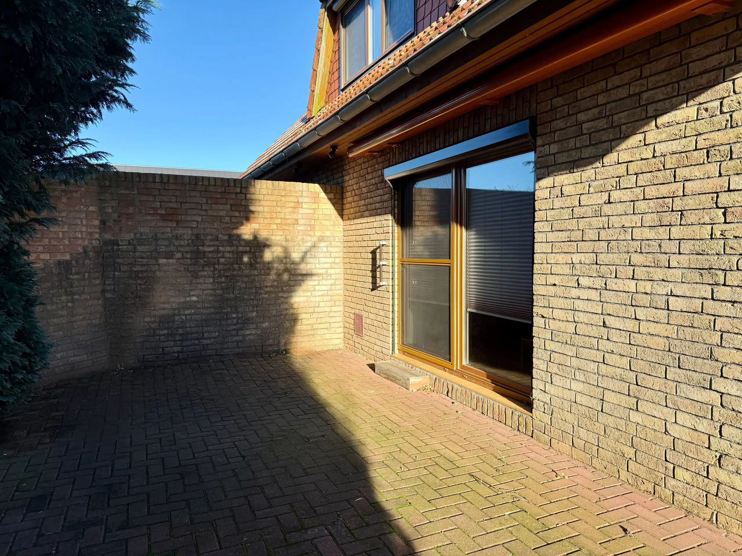 Die Einliegerwohnung ist sowohl über die Verbindungstür im Haupthaus als auch über einen eigenen Eingang zugänglich. Sie befindet sich im Erdgeschoss und ist bis zum 31.01.2026 vermietet; aus Gründen der Privatsphäre wurden daher keine Innenaufnahmen erstellt. Der Grundriss umfasst eine Diele, von der aus rechts die Küche sowie das Badezimmer erreichbar sind. Geradeaus gelangt man in das Wohnzimmer und das Schlafzimmer. Im großen Wohnraum wurde nachträglich ein zusätzlicher kleiner Raum aus Leichtbauwänden geschaffen, der aktuell als Schlafzimmer genutzt wird.