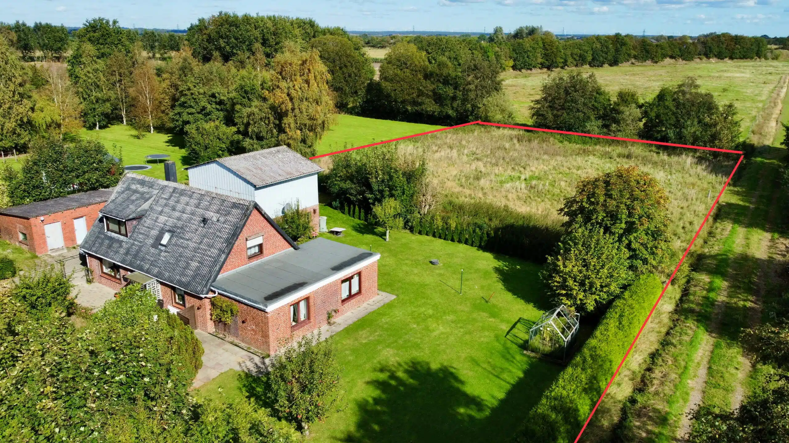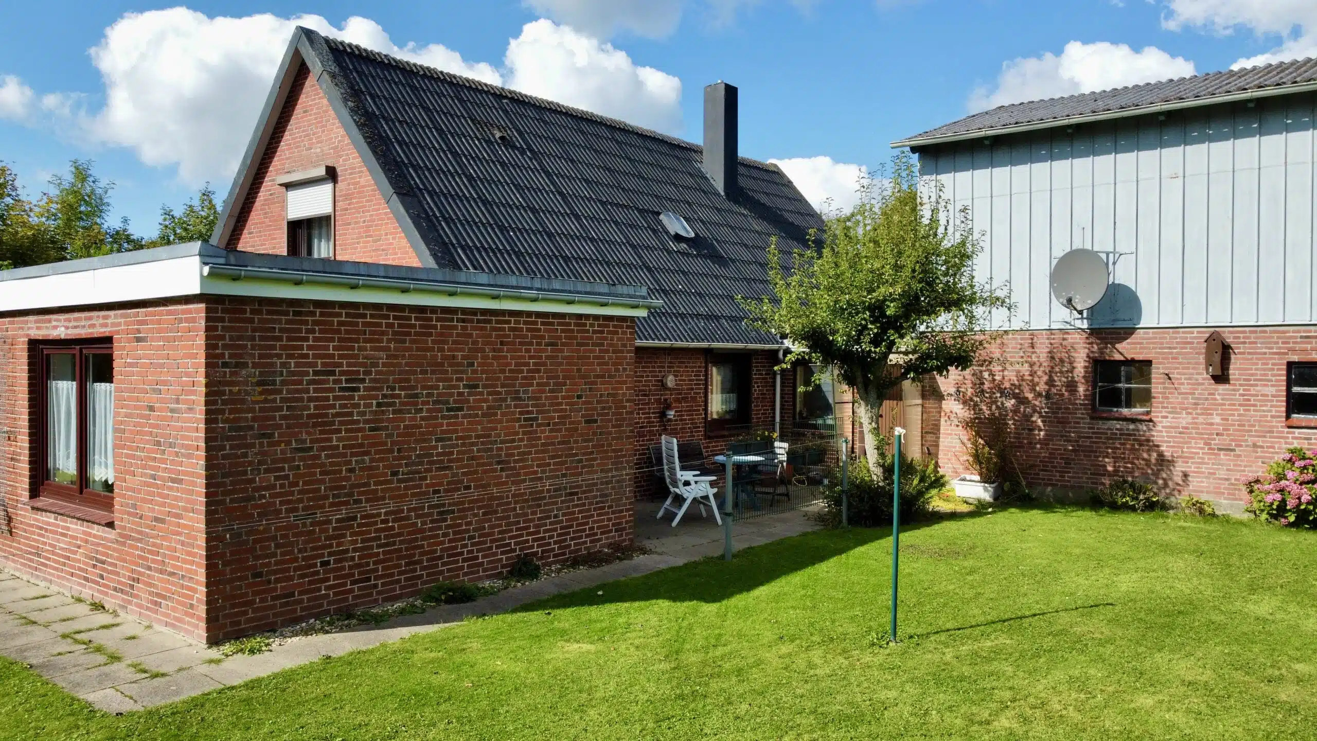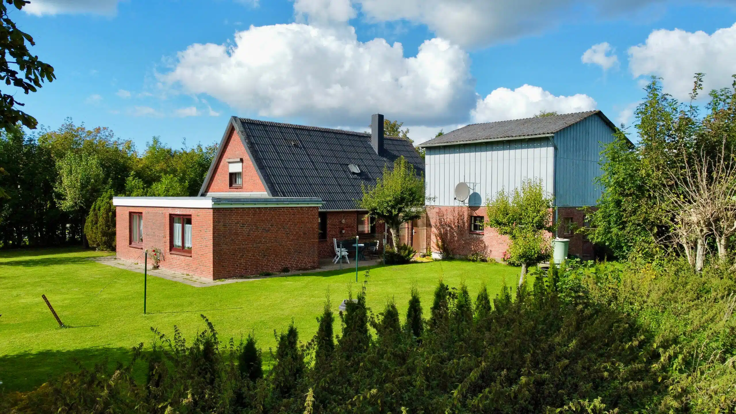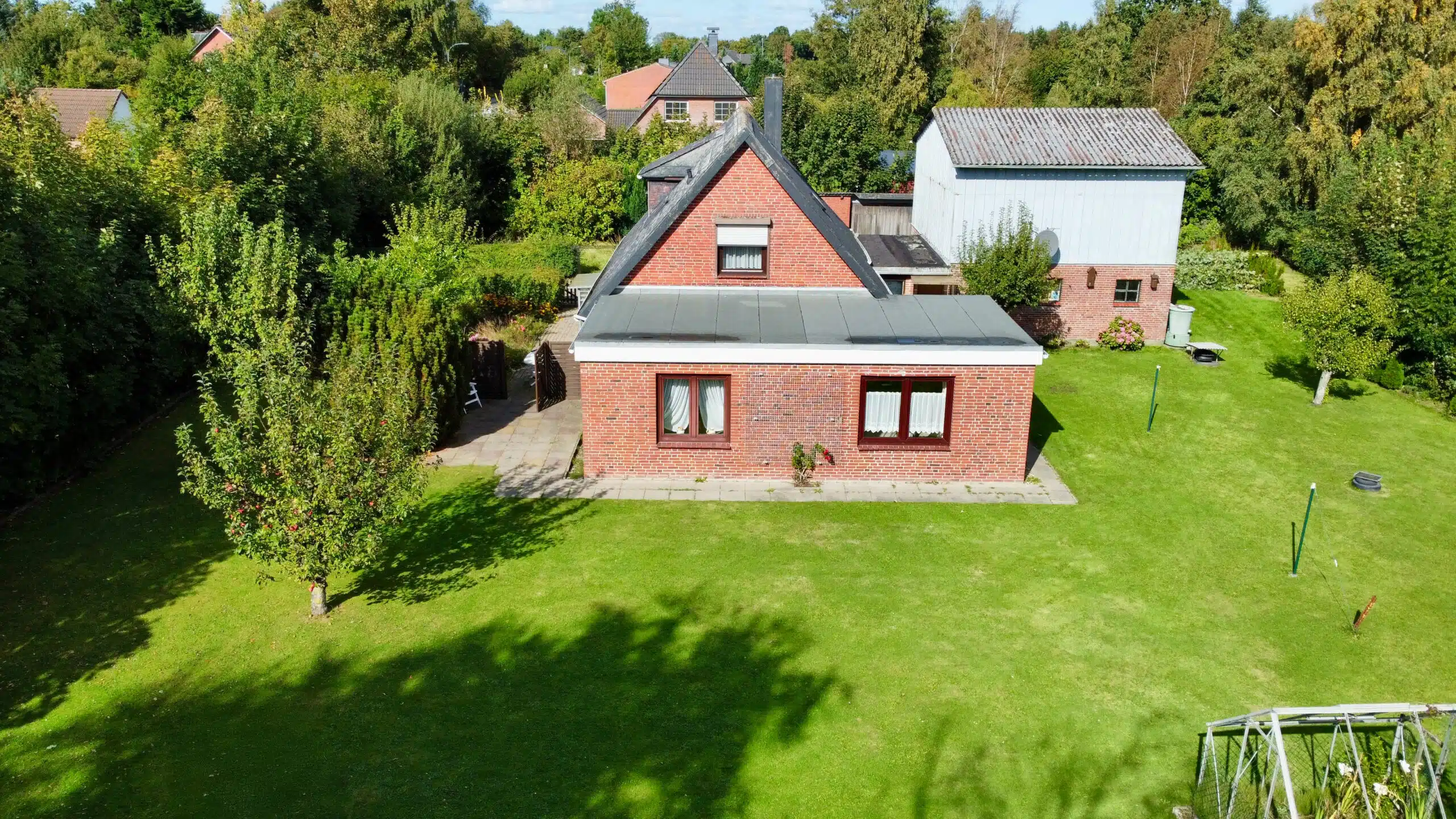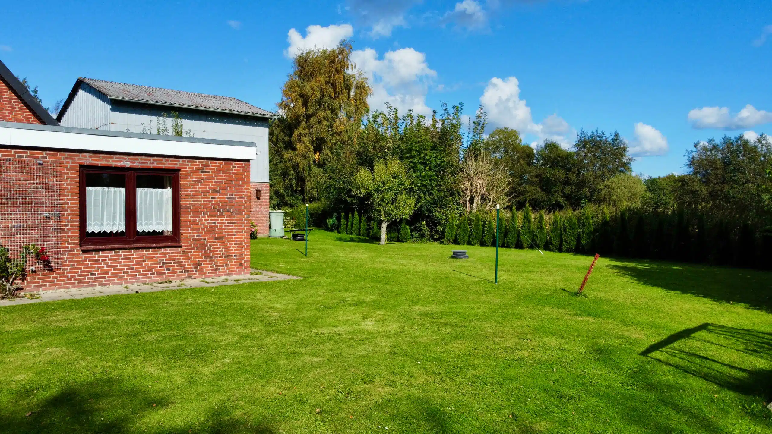 Das große Grundstück ist schön eingewachsen und vermittelt ein hohes Maß an Privatsphäre. Die Umgebung ist geprägt von Einfamilienhäusern, landwirtschaftlichen Gebäuden und weiten Grünflächen – ideal für alle, die Ruhe und Natur schätzen.
